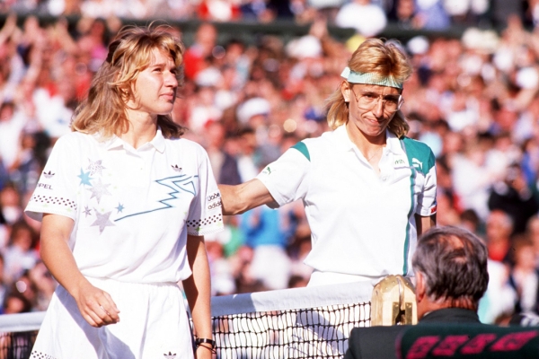After losing the Wimbledon final to Martina Navratilova (R) in 1987, Steffi Graf (L) avenged that defeat in the 1988 final, on her way to sweeping all four Grand Slam singles titles and Olympic gold in her stunning 1988 season. [Getty Images]