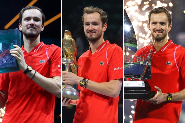 Daniil Medvedev won three titles in three consecutive weeks, first in Rotterdam (left) then in Doha (centre) and Dubai (right). [Getty Images]