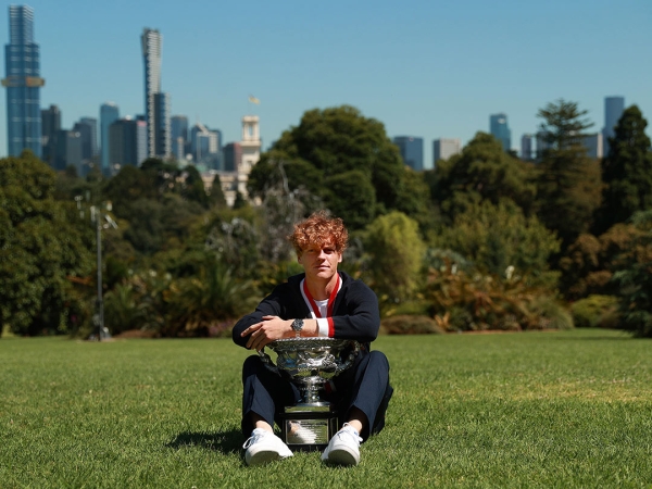 AO 2024 men's singles champion Jannik Sinner poses with his trophy at Melbourne's Royal Botanic Gardens on Monday 29 January. [Getty Images]