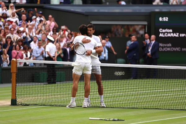 Carlos Alcaraz and Novak Djokovic embrace after Alcaraz won their Wimbledon final in five thrilling sets. [Getty Images]